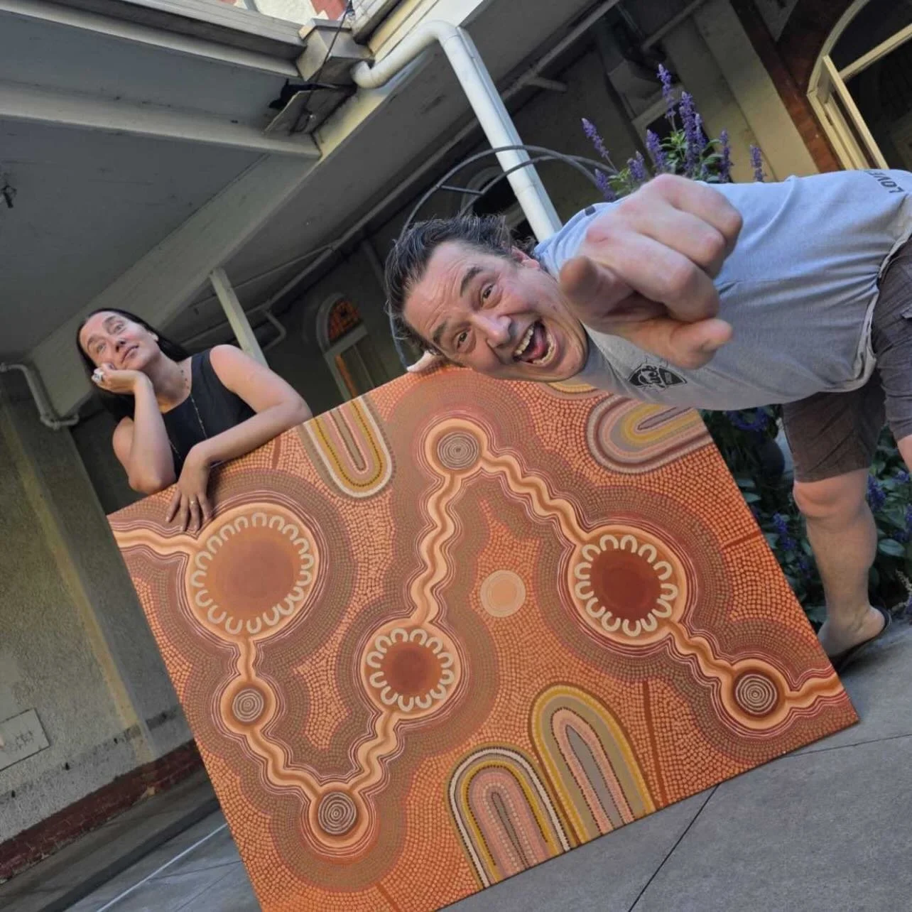 I’ve donated my large-scale work Dry Creek Bed to support Love Your Sister as part of their fundraising auction. Painted in 2020 and spanning over a metre wide, this piece holds deep personal and cultural significance for me - created during a time of healing on red dirt Country and grounded in my connection to story, memory and belonging. My practice continues to evolve through learning, cultural exchange and guidance from Elders, and this work reflects that journey through a contemporary interpretation of traditional iconography.